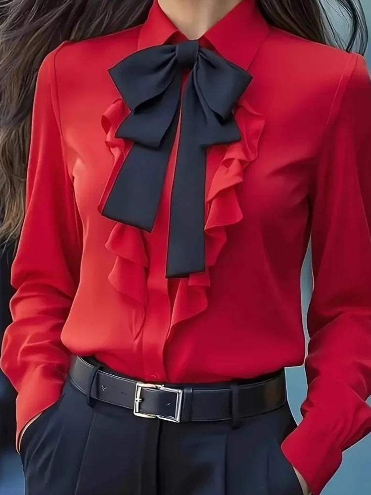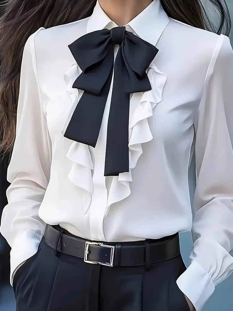 Women's Spring Autumn Turn-Down Collar Bow Patchwork Blouse Long Sleeve Chic Single-Breasted Ladies Shirt 2025 Solid Streetwear