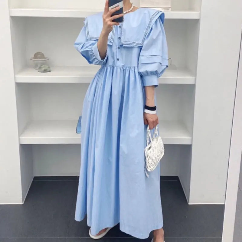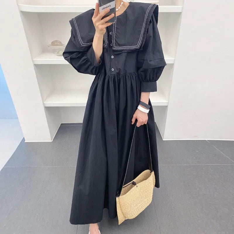 Clothland Women Stylish Straight Dress Sailor Collar Blue Black Long Top Vintage Ankle Length Dresses Vestidos Maxi LA482