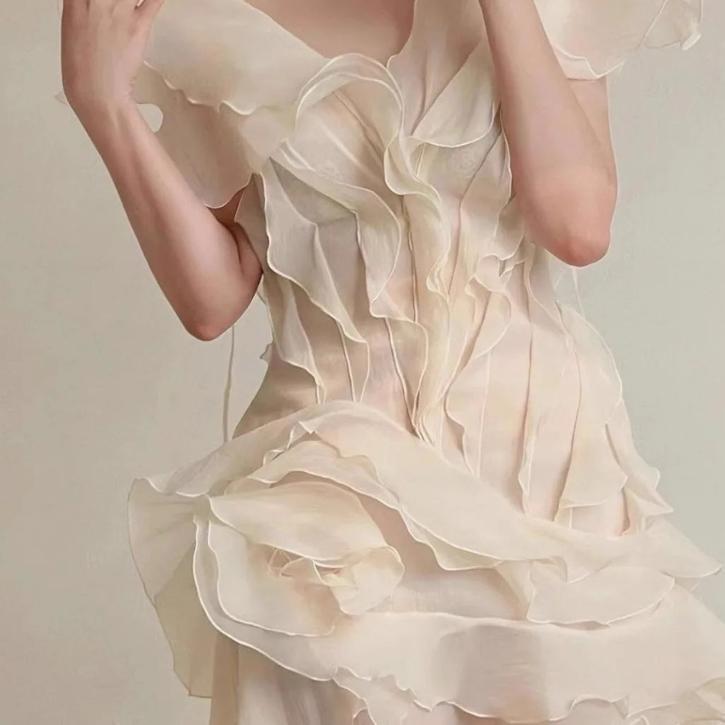 2025 New Ruffle Dress Niche Design Flowers Gentle Sweet Short Skirt Irregular About
