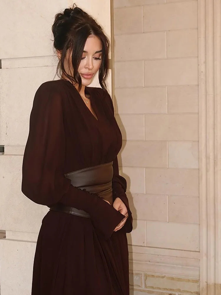 Vintage Nipped Waisted Long Sleeved A-line Dress Elegant V Neck Split Long Dresses 2024 Women Loose Vintage Party Long Dresses