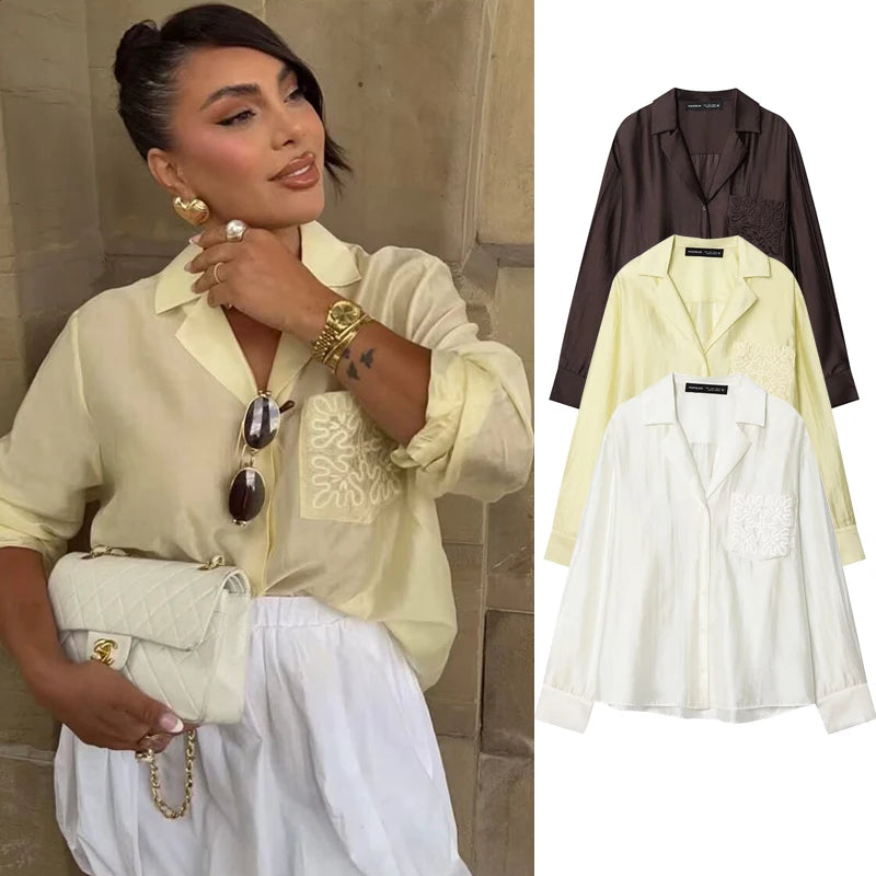 New Women's Shirts Autumn 2025 New Retro Embroidery Elegant Pocket Fashion Office Shirts Women's Autumn Chic Youth Street Shirts