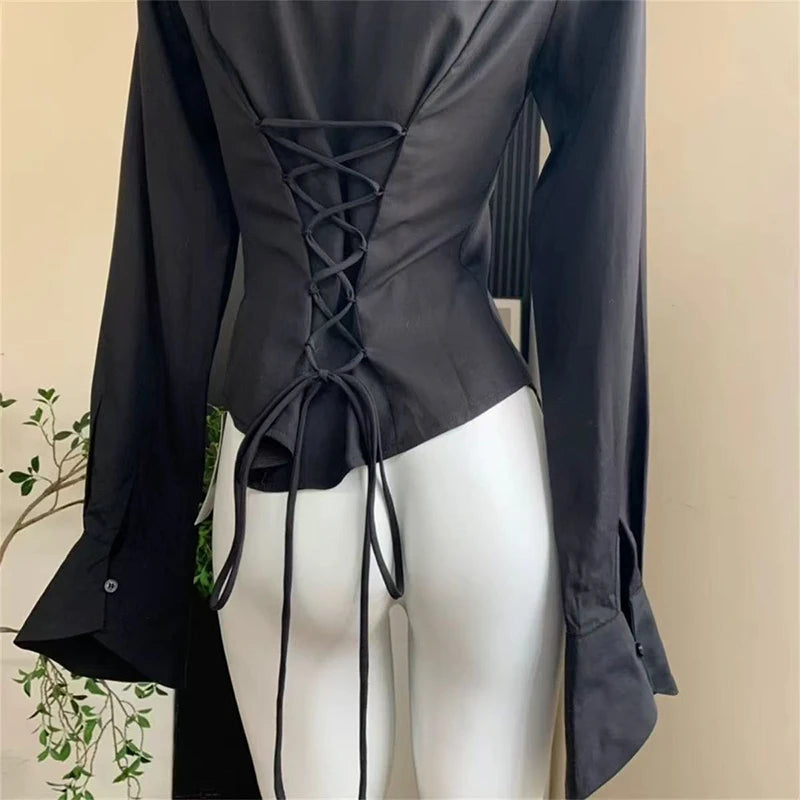 Fashion Lace Up Women Shirts Korean Slim Bell Sleeve White Blouse Spring New Streetwear All Match Ladies Button Tops