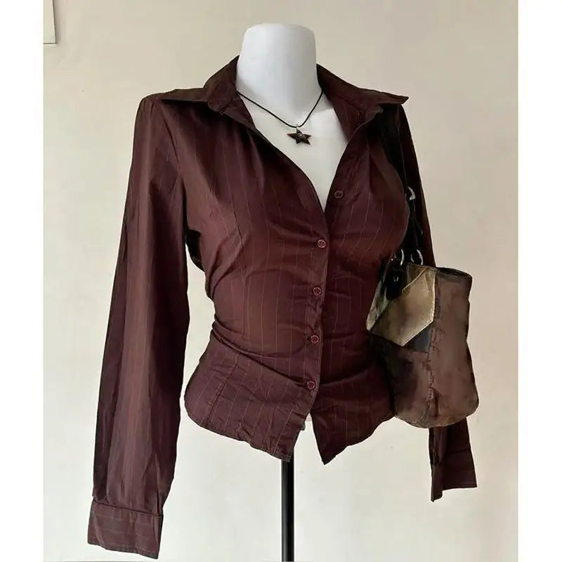 2025 Summer New Retro Classic Shirt Female Korea Fashion Long Sleeved Slim Shirt Stripe Y2k Brown Single-breasted Tops Women New