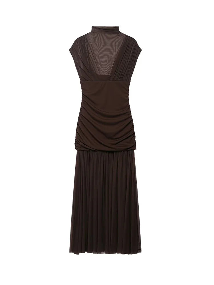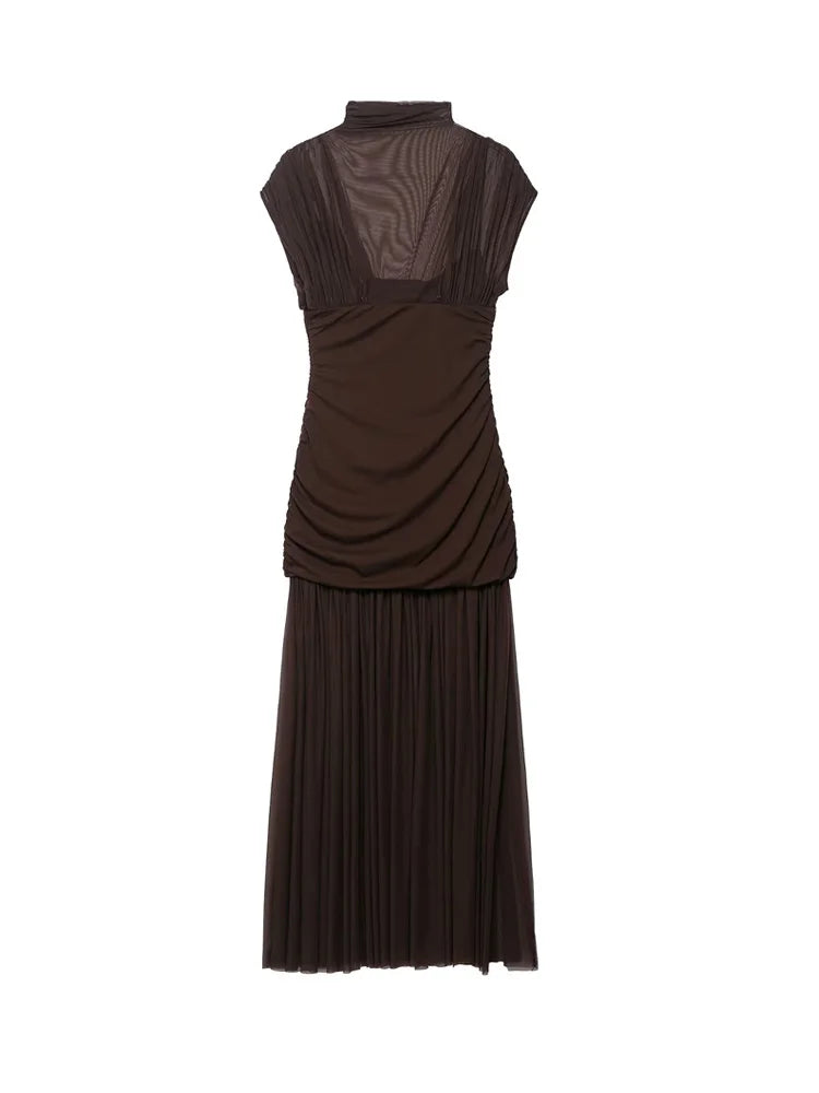 Women's High Neck Sleeveless Tulle Draped Midi Dress Fashion Contrast Female Vestidos Mujer