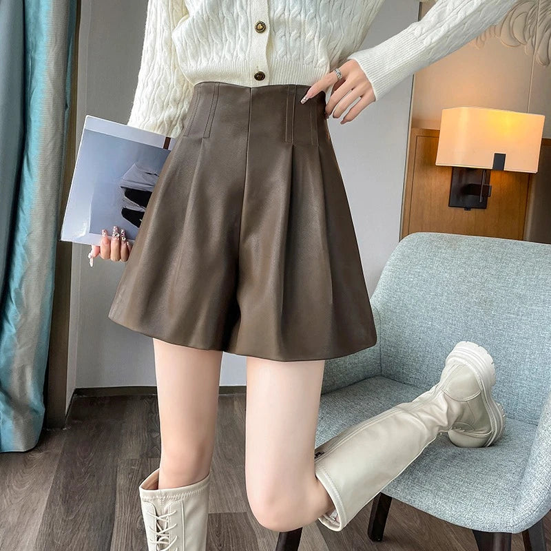 High Waist Vintage Black PU Leather Women's Wide Leg Shorts Casual Loose Straight A-line Short Pants Female New Autumn Winter