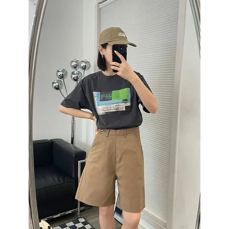 Zipper High-waisted Shorts for Women Straight and Loose Fit Thin Summer Casual Cargo Pants in Khaki Color Five-minute Pants