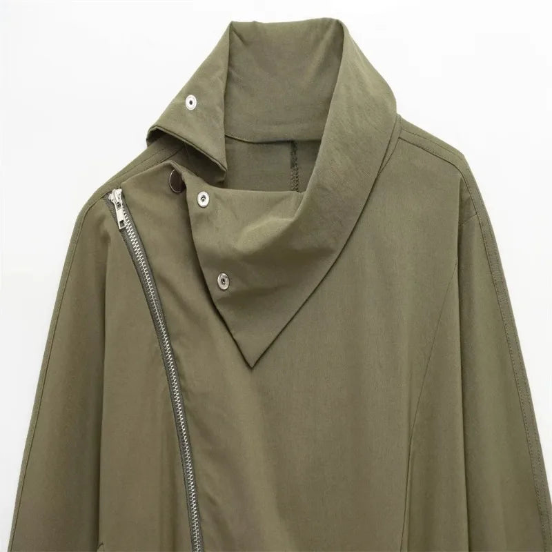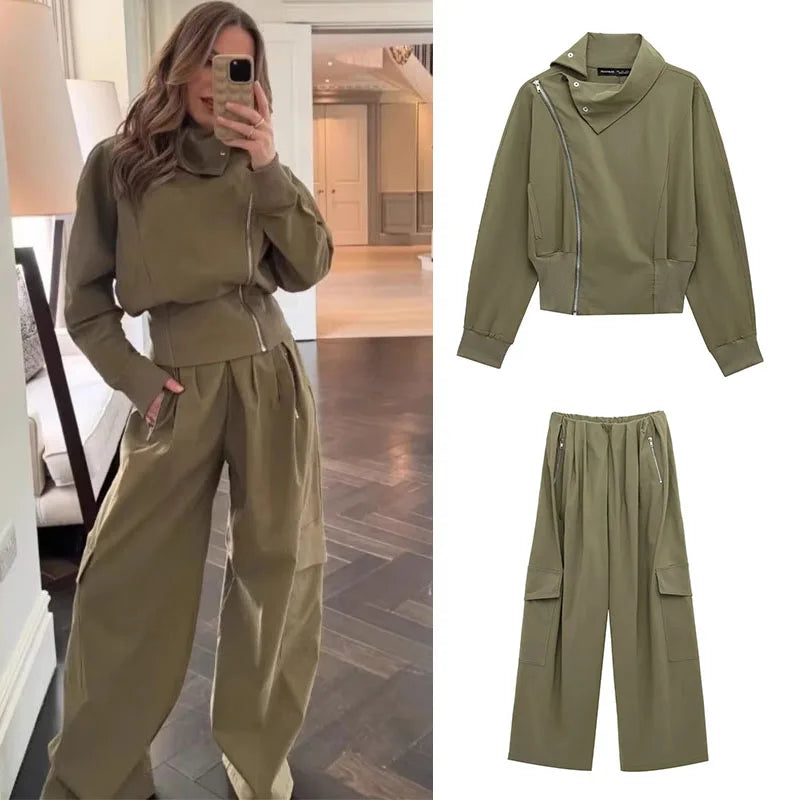 Women Two Pieces Sets Cowl Neck Asymmetric Zipper Jackets+Elastic Waist Wide Leg Cargo Pants Spring Autumn Female Chic Outfits