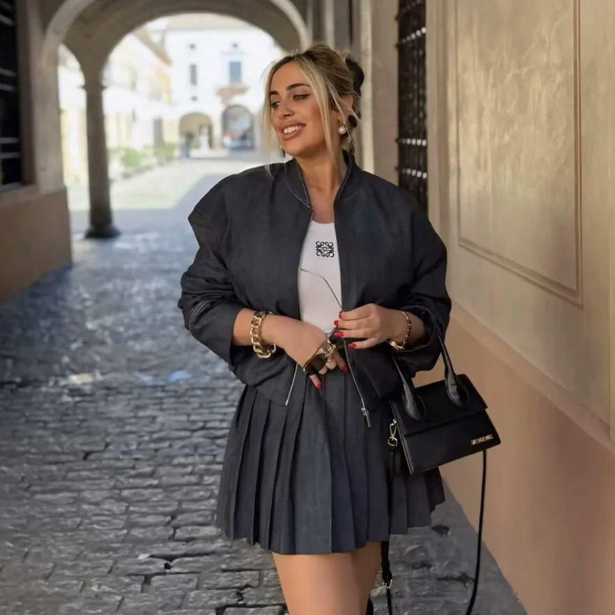 2 Pcs Women Denim Skirt Suit Autumn V-neck Long Sleeve Jacket Coat Or Mini Pleated A-line Skirts Grils Slim Outwear Sweater Set