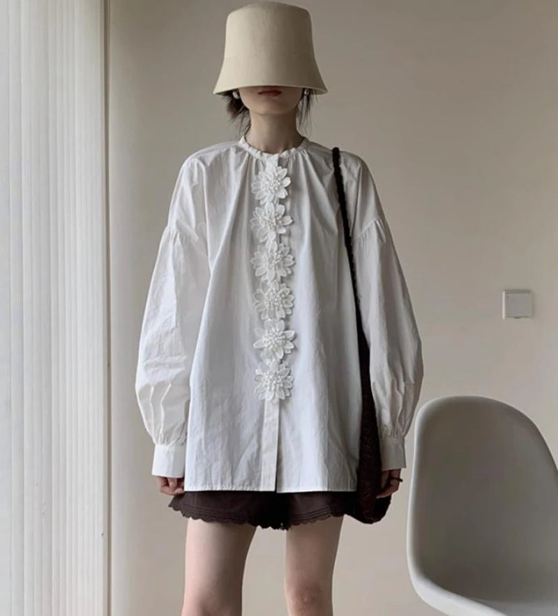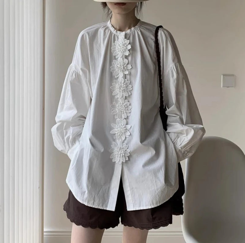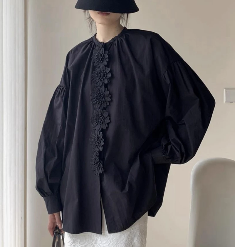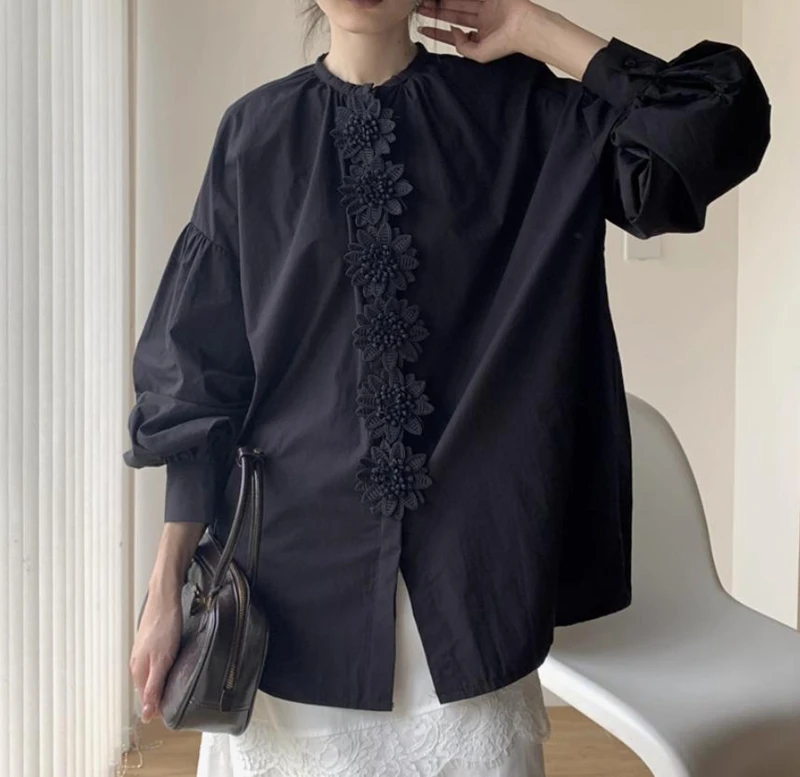 2025 Autumn French Round Neck Single-Breasted Blouse Lantern Sleeve Three-Dimensional Flower Long Shirt Loose Slimming Top