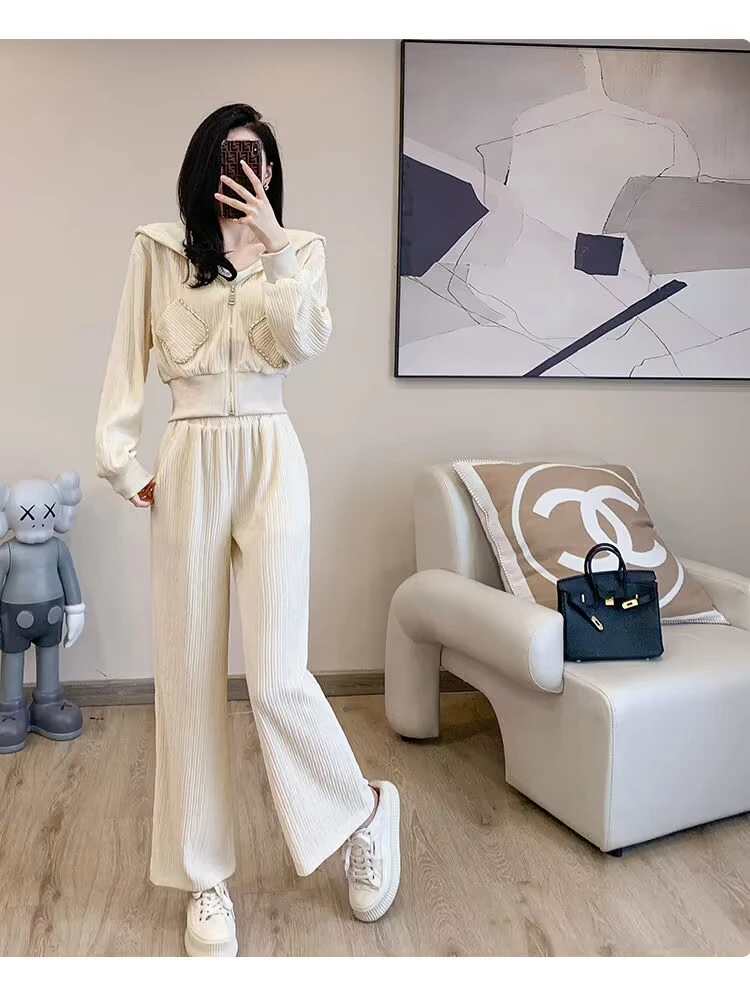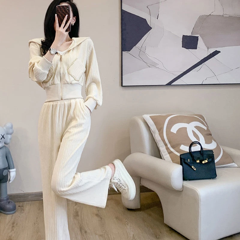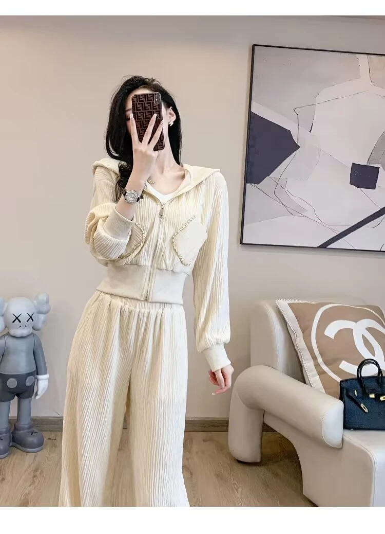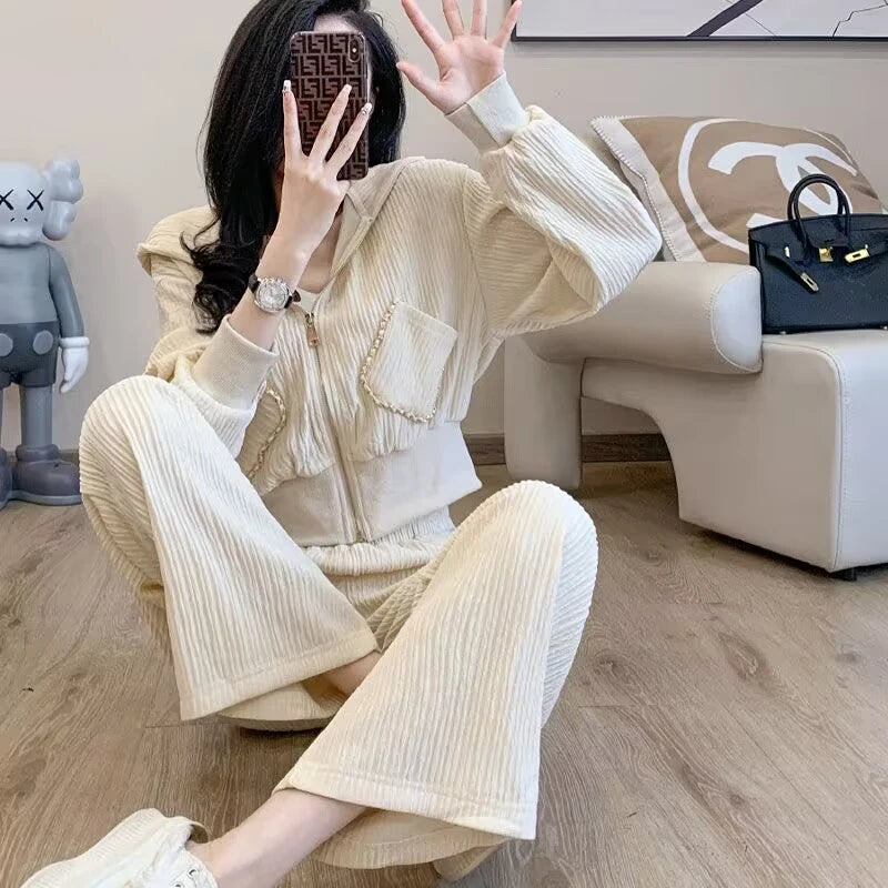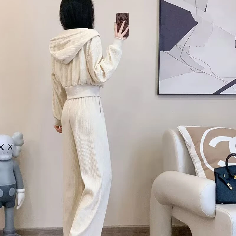 The set includes a hooded sweatshirt and wide-leg pants, providing a versatile look suitable for various occasions.