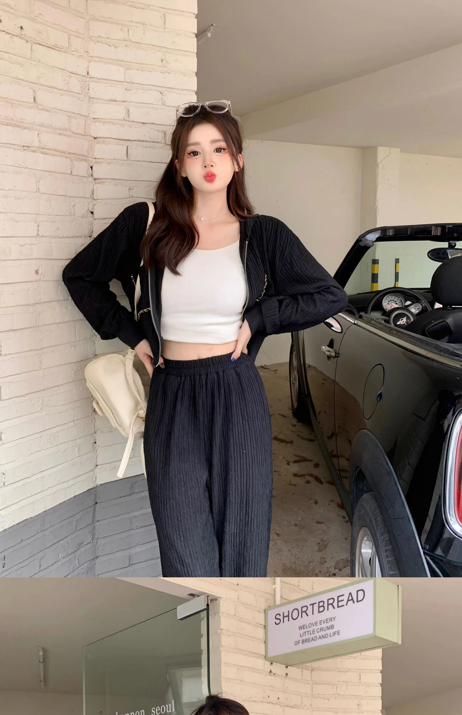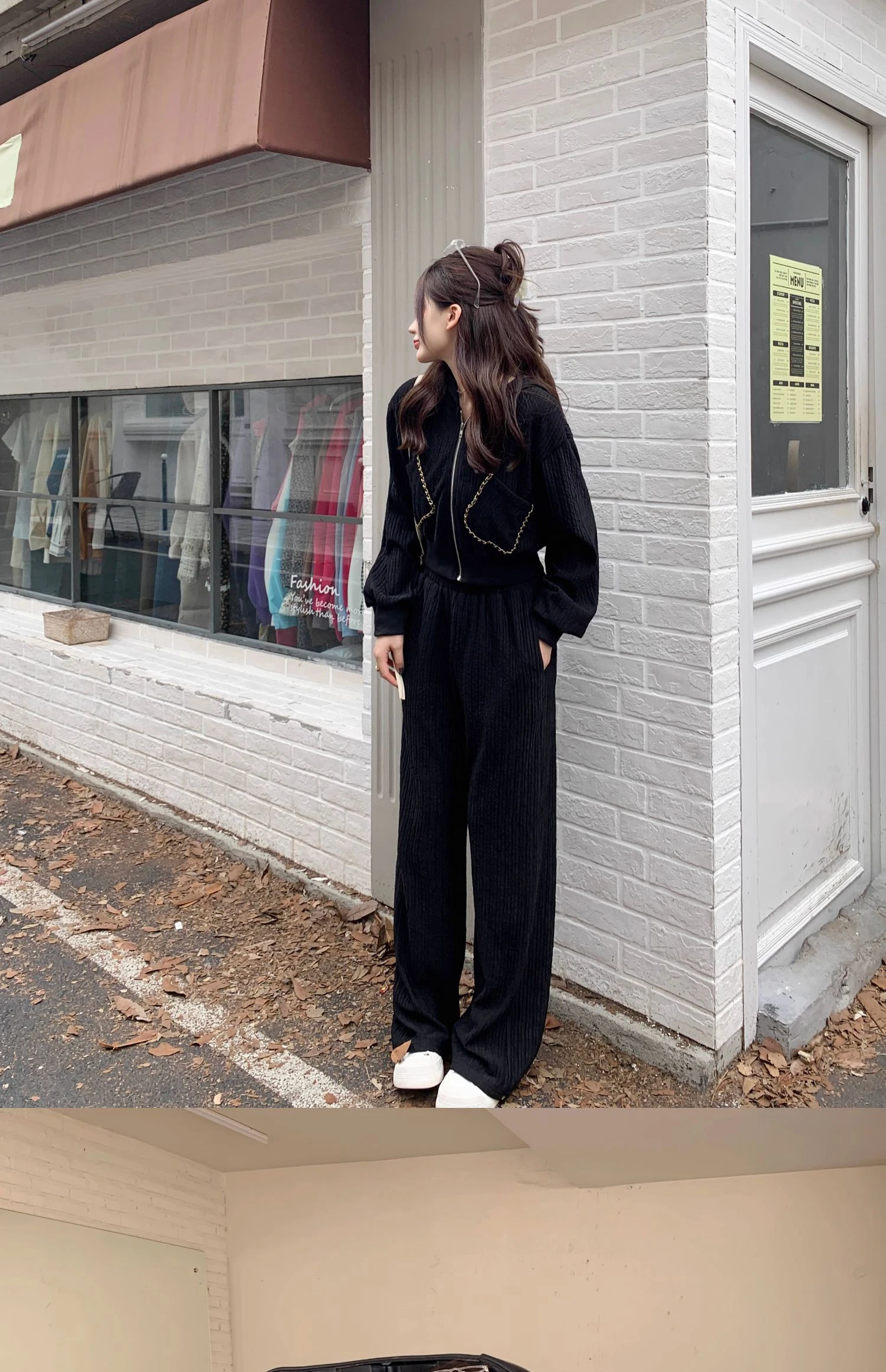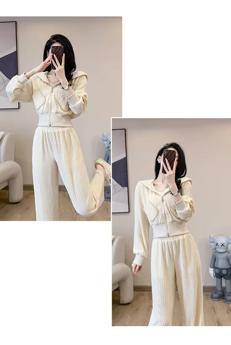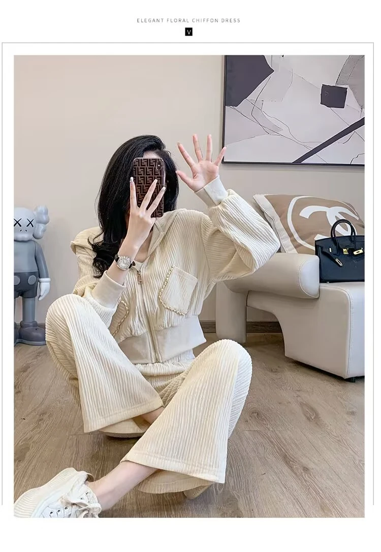 The set includes a hooded sweatshirt and wide-leg pants, providing a versatile look suitable for various occasions.