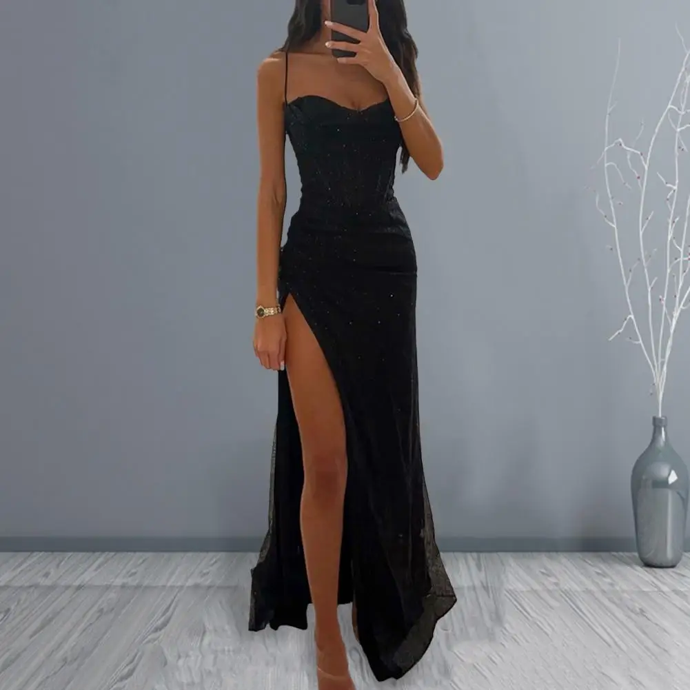 Women Evening Dress Spaghetti Strap Shiny Sequin Sleeveless Off Shoulder Low-cut High Split Loose High Waist Floor Length Lady Prom Dress