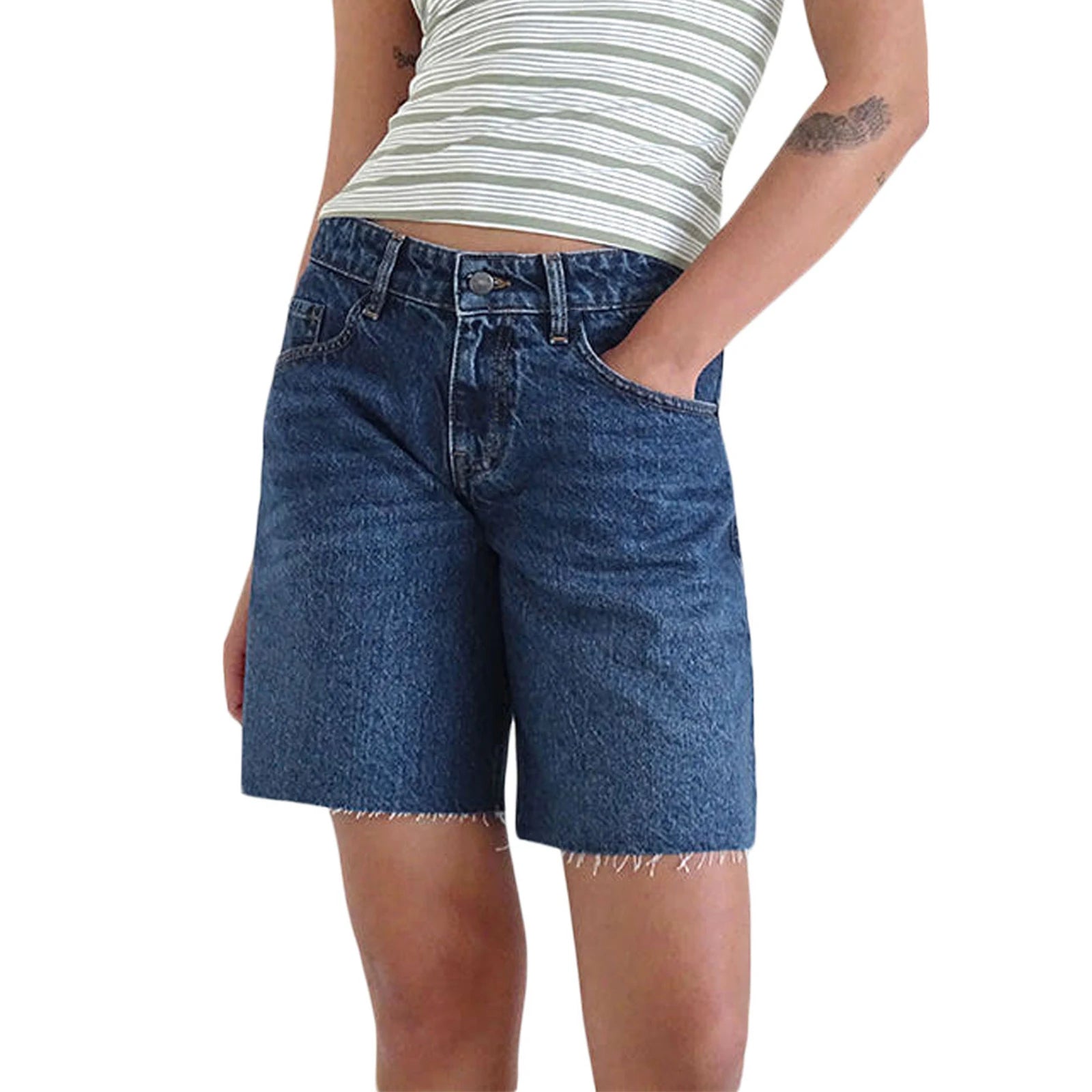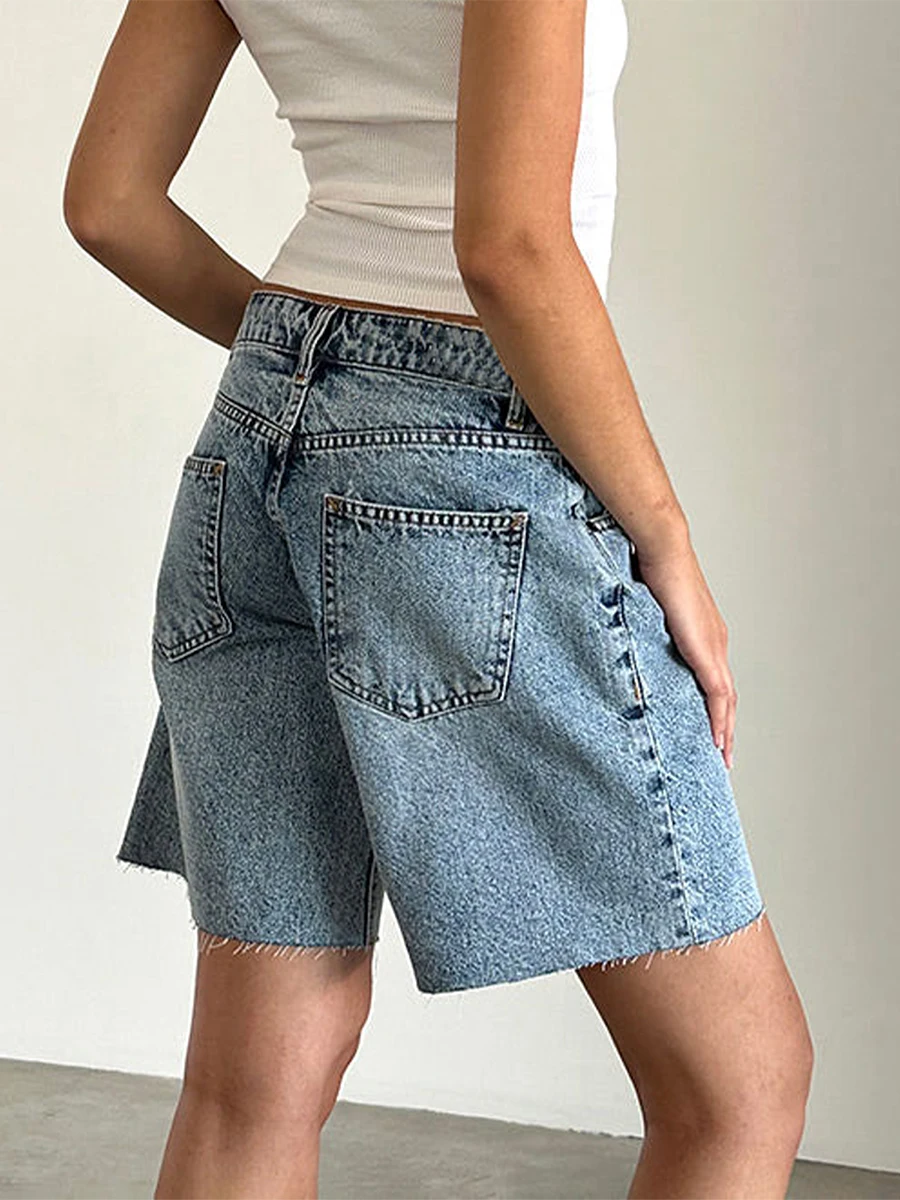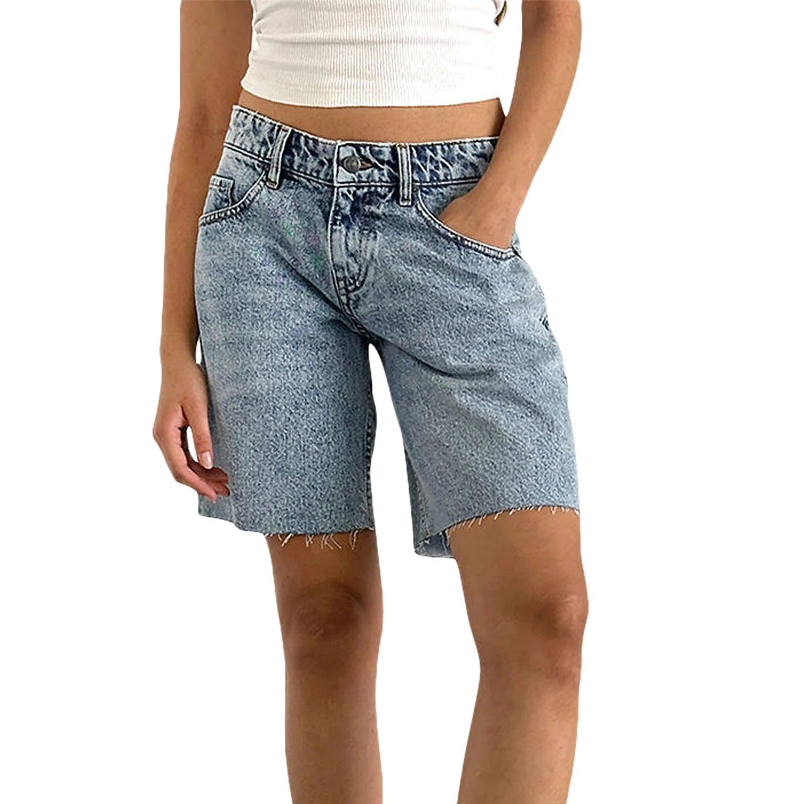 Women's Knee Length Denim Shorts Loose Solid Color Wide Leg Raw Hem Vintage Bermuda Shorts with Pockets for SummerSize (cm)
