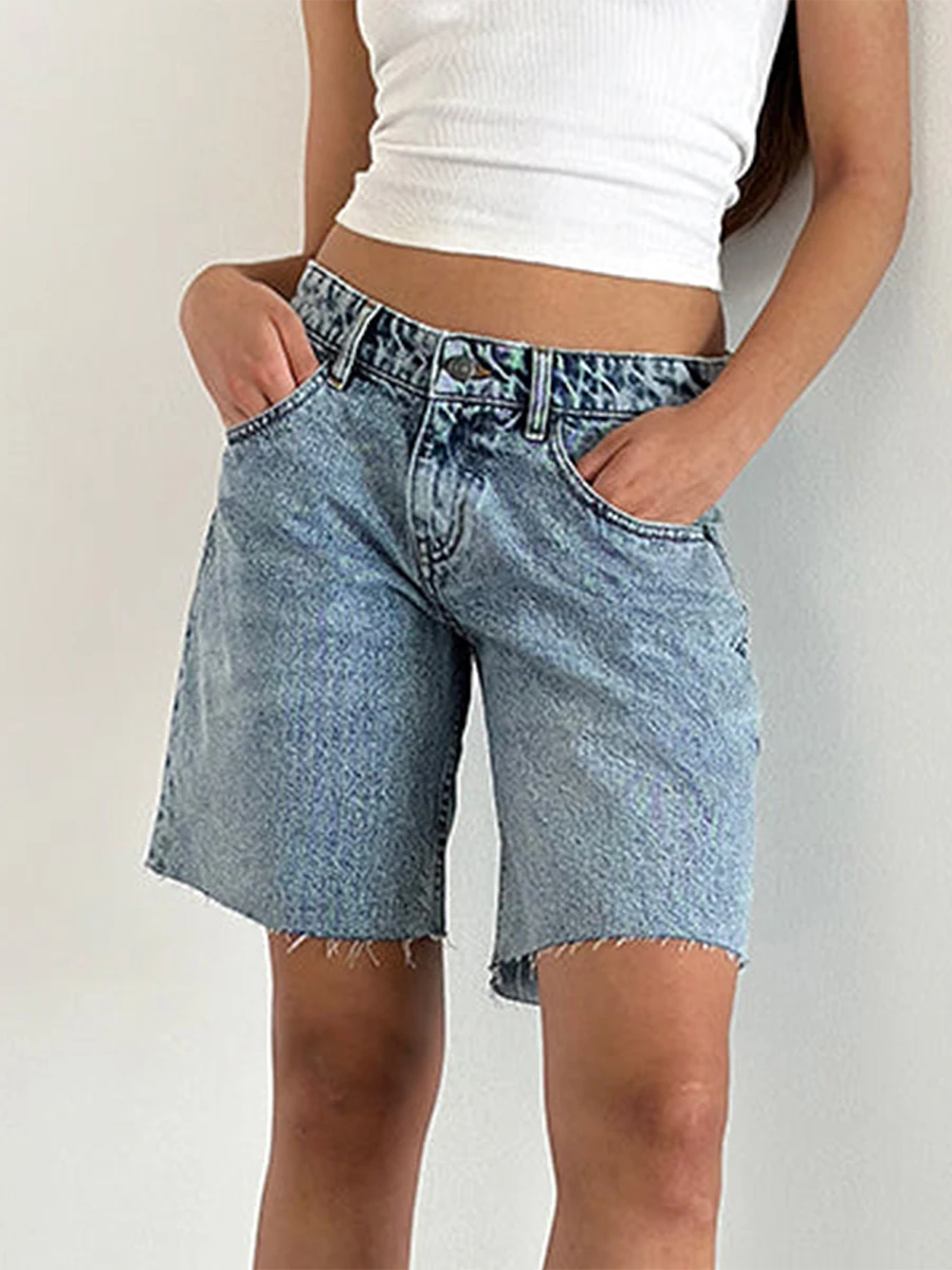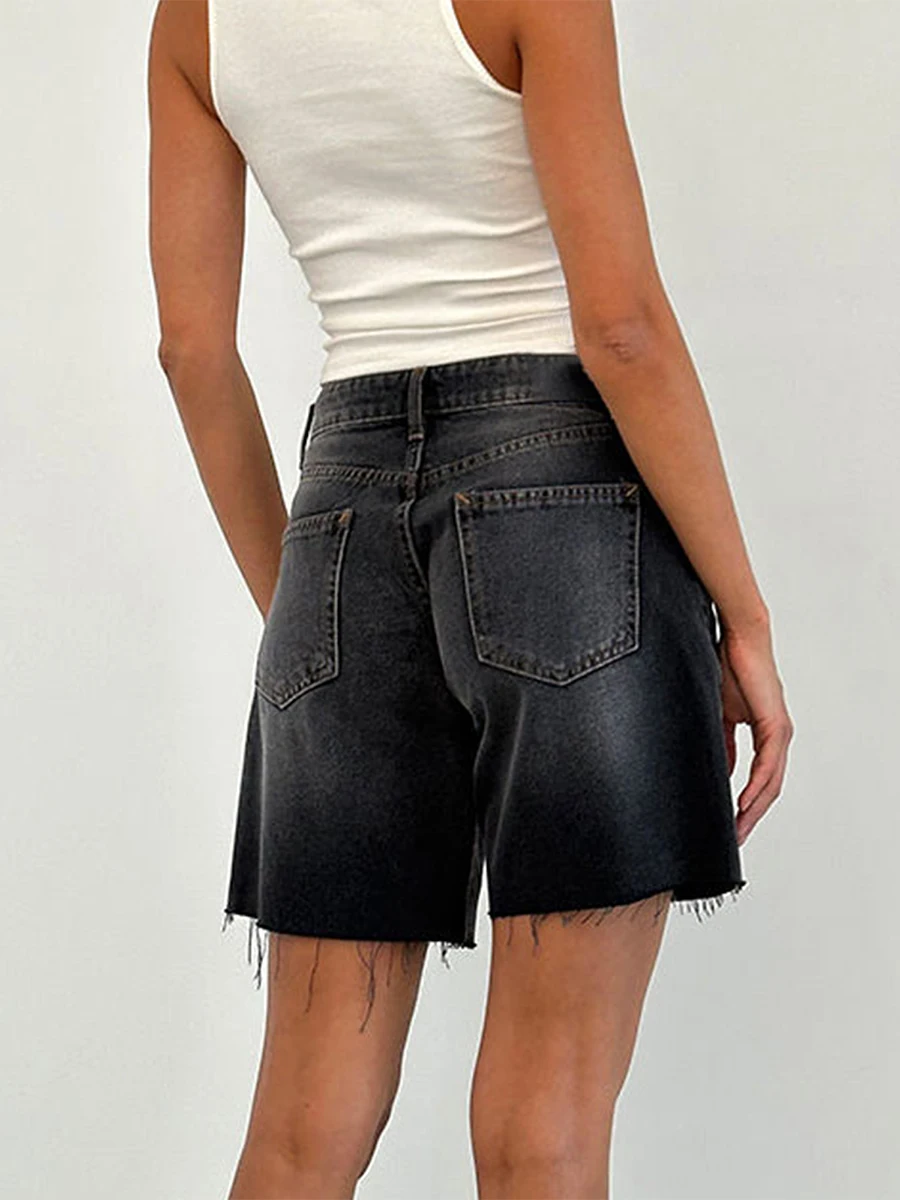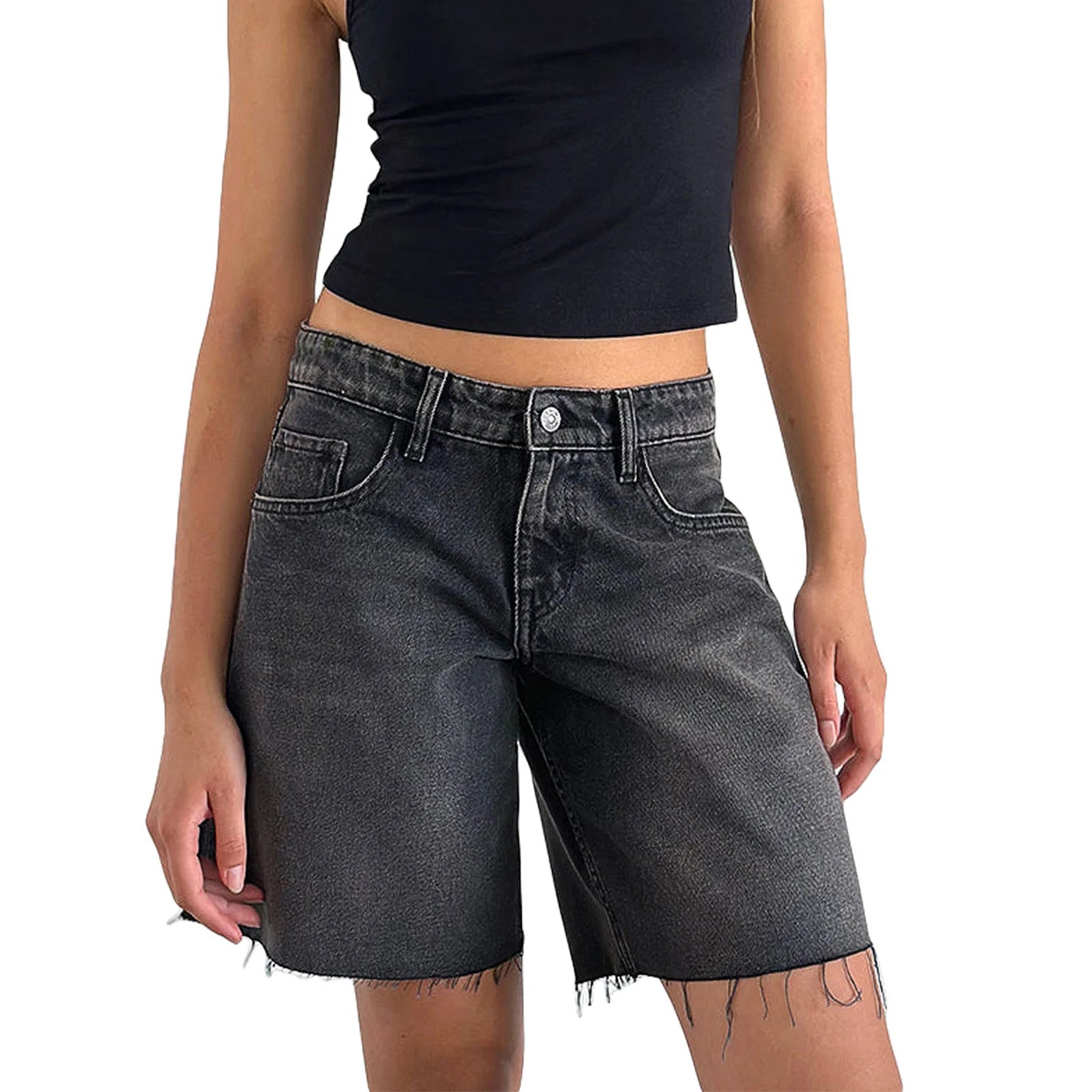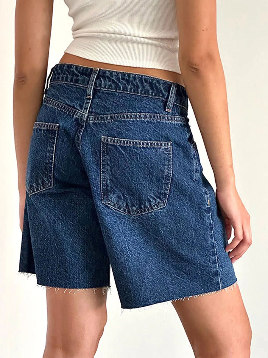Women's Knee Length Denim Shorts Loose Solid Color Wide Leg Raw Hem Vintage Bermuda Shorts with Pockets for SummerSize (cm)